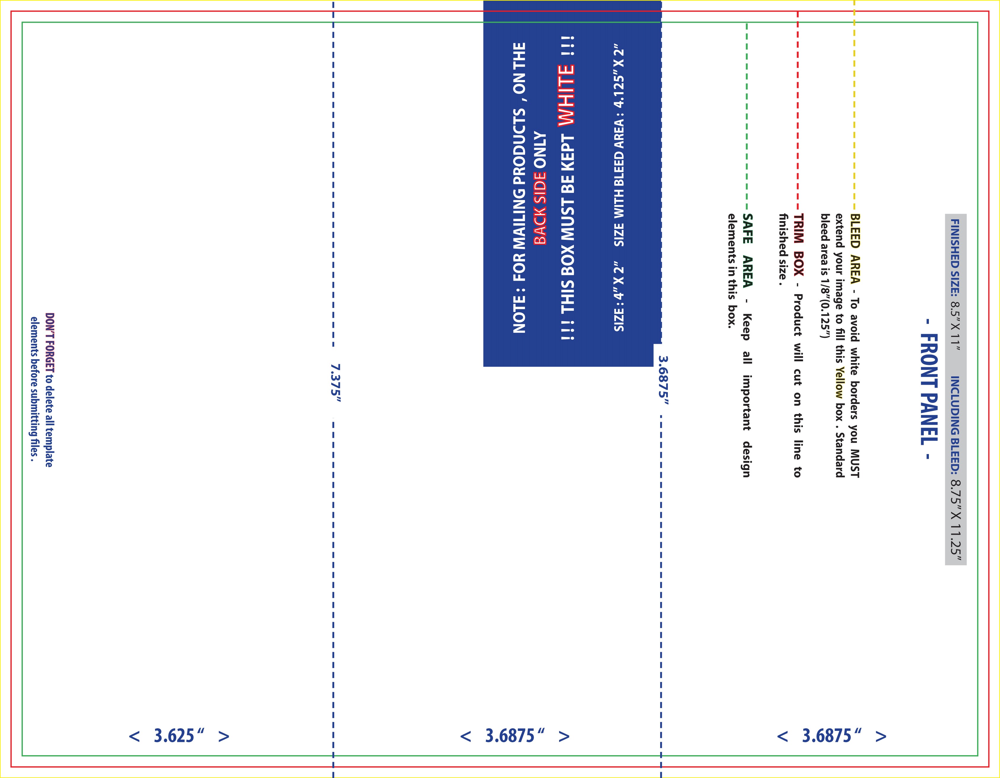 • Safe Area is the 1/8" (0.125") area inside the trim line. Do not put critical information or images within the Safe Area. This is to prevent minor cutting variations from leaving unintended results at the trim edge.