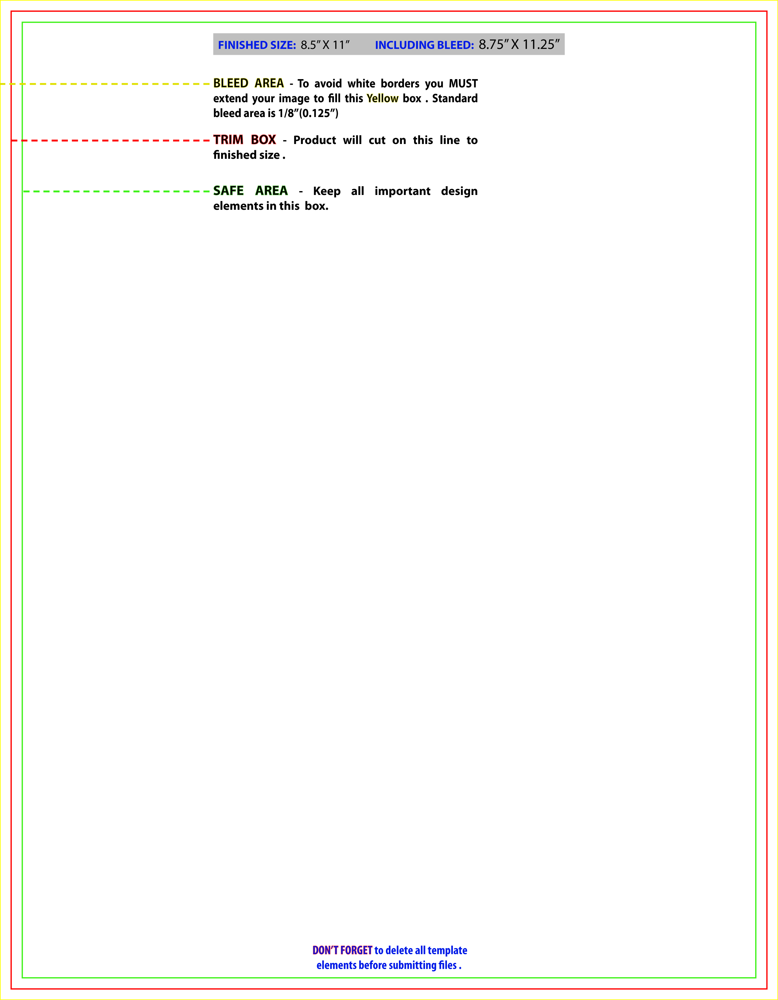 • Safe Area is the 1/8" (0.125") area inside the trim line. Do not put critical information or images within the Safe Area. This is to prevent minor cutting variations from leaving unintended results at the trim edge.